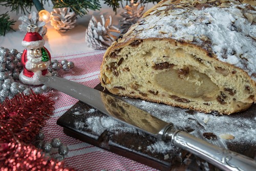 Kerststol is a type of bread the Dutch eat around the holidays. Stuffed with almond paste and dried/candied fruits, soaked in brandy and lemon, and rolled along with marzipan, the oval-shaped roll is then baked until it’s warm and crispy on the outside and gooey and delicious on the inside. The finishing touch is usually powdered sugar, which is heavily sprinkled on top before the cake is cut into slices and served with butter.