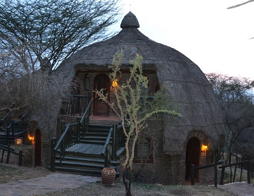 The luxurious Arusha Serena Hotel Resort & Spa, a former coffee farm during colonial times, is nestled within tropical forests, gardens, and at the edge of Lake Duluti. The huts are made of large concrete gray blocks with rounded triangular-shaped thatched layered roofs and triangular entry archways leading into each individual room. Lakeside dining is available.
