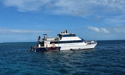 - Cost – The price for 2 nights for 2 adults sharing is around $1,320 AUD plus a reef levy fee of $90 AUD. Traveling with an infant under 2 years of age adds $100 AUD, or $360 AUD for a small child under 12. The cost includes all meals, dive/snorkel equipment, all snorkeling sessions, and a glass bottom boat excursion. Wet suits ($10 AUD), prescription masks ($20 AUD), underwater cameras ($59 AUD), and diving packages are extra. The Reef Encounter provides full-body stinger suits during stinger season, which spans from around November through May, at no additional cost.