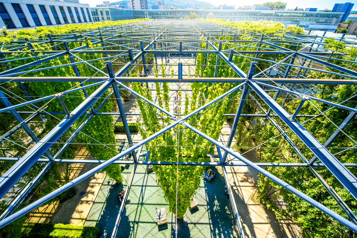 One of the most unique features of MFO Park is the way it seamlessly blends contemporary architecture with nature. The steel frame, with its green ivy, adds to the park’s natural beauty and creates a true masterpiece of modern design.