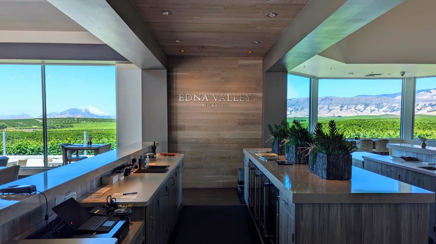The contemporary tasting room of Edna Valley Vineyards, owned by E&J Gallo Winery, stands on the site of the valley’s first grape plantings by grocer Jack Niven in 1973. Today it hosts the tastings of avant-garde Language of Yes wines. Image courtesy Craig Stoltz.