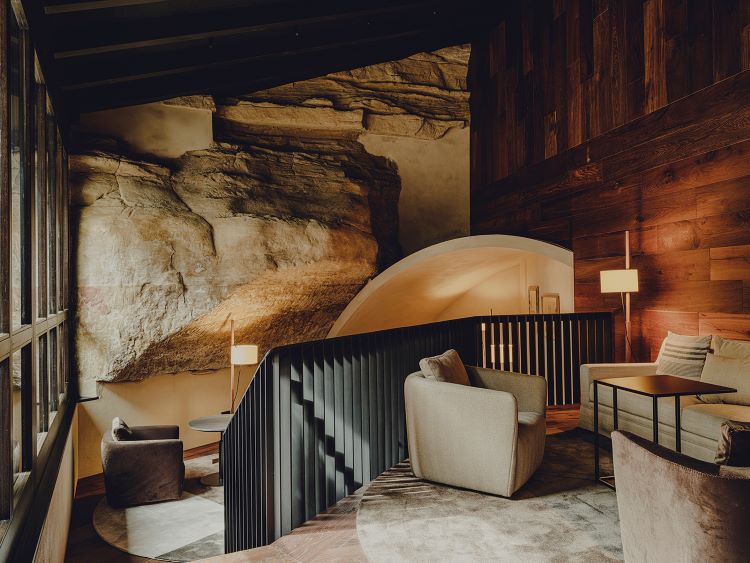 Typical of manor homes of the era, it has an ancient wine cellar, or calado, excavated from mountain rock restored to pristine condition. The dining room showcases authentic regional Riojan cuisine, and there’s a curious small stone staircase leading down to a former wine press where guests can enjoy a glass of Rioja Reserva.