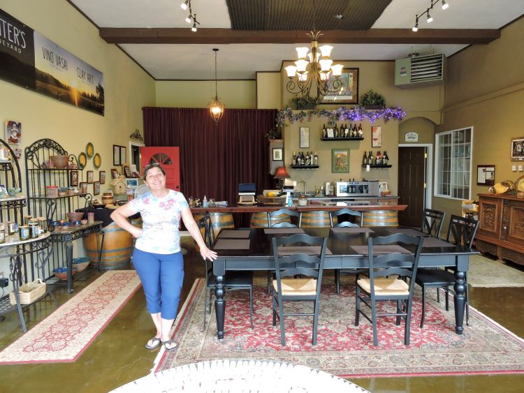 A beautiful art gallery is the setting for wine tasting at Potter’s Vineyard. Stylishly decorated with displays of colorful, clay art products handcrafted by Bill along the walls, the tasting room really comes alive when Bill Sanchez presents his 10th vintage Vino Vasai, Italian for Potter’s wine. Seated at large tables in the center of the gallery, guests sample wines served one glass at a time by Sandy as Bill explains their character, complexity, and the vineyard that produced them.