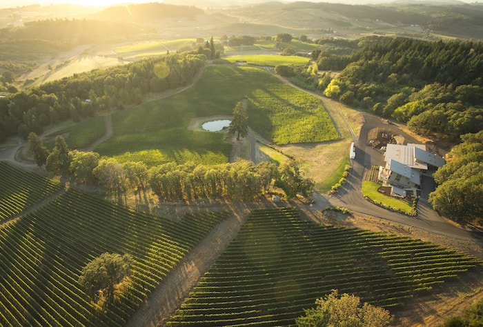 Aerial views over Alexana winery & tasting room, Dundee Hills, Willamette Valley, Oregon